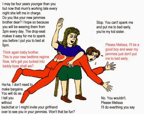 When nineteen year old Philip teased his taller fourteen year old cousin Melissa about her 7pm bedtime it ended up in a boisterous wrestling match that Philip lost. Philip's aunty wasted little time in ordering Melissa to put on her pyjamas and placed her across her lap for a spanking. Then she ordered her daughter into the corner. Philip was smirking to himself. Aunty fixed him with her deadly stare. "You can wipe that smile off your face too my lad. Go and fetch your pyjamas, I am quite aware that you weren't blameless in this affair. You will receive the same punishment as Melissa." Philip, redfaced, shook his head in defiance but this only infuriated aunty even further. She marched upstairs and returned with his pyjamas in her hands. Twisting his ear lobe to turn him around she swatted his backside. "Clothes off now!" She ordered. Shocked by her actions Philip slowly began to remove his things until he was wearing only his underpants. Melissa giggled. "Quiet young lady unless you want to go back over my knee." Melissa quickly became silent. "Those too," aunty said, pointing at his ridiculous white underpants. Reluctantly he stripped revealing his nakedness. Aunty motioned him toward her. She slipped his arms into the pyjama top and buttoned it up. "Over you go." she motioned, tapping her lap. "But aunty I'm nineteen," he whined. "But you behave like a nine year old," she retorted. Aunty smacked his bottom twice as long and twice as hard as she had Melissa's. So hard and so long in fact that way before she had finished Philip was bubbling like an infant. "You're just a little crybaby aren't you Philip", She taunted as she stepped him into his pyjama bottoms. "In fact you act much younger than Melissa don't you? Go and stand in the corner beside your cousin. Tonight you will both go to bed at 6pm but for the rest of your stay Philip your regular bedtime will remain at 6pm with pyjamas on by 5. Then we will see how you enjoy being teased about your early bedtime." Philip shuffled miserably into the corner alongside his cousin and through the brushed cotton material of his pyjamas gave his painful bottom a rueful rub.